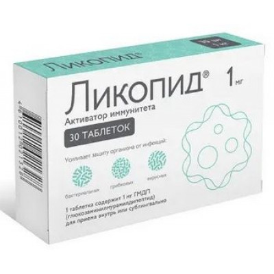 Действующее вещество таблеток Ликопид® – глюкозаминилмурамилдипептид (ГМДП) – представляет собой синтетический аналог структурного фрагмента оболочки (пептидогликана) бактериальных клеток. ГМДП является активатором врожденного и приобретенного иммунитета, усиливает защиту организма от вирусных, бактериальных и грибковых инфекций; оказывает адъювантный эффект в развитии иммунологических реакций. Биологическая активность препарата реализуется посредством связывания ГМДП с внутриклеточным рецепторным белком NOD2, локализованным в цитоплазме фагоцитов (нейтрофилов, макрофагов, дендритных клеток). Препарат стимулирует функциональную (бактерицидную, цитотоксическую) активность фагоцитов, усиливает презентацию ими антигенов, пролиферацию Т- и В-лимфоцитов, повышает синтез специфических антител, способствует нормализации баланса Тh1/Тh2-лимфоцитов в сторону преобладания Th1. Фармакологическое действие осуществляется посредством усиления выработки ключевых интерлейкинов (интерлейкина-1, интерлейкина-6, интерлейкина-12), фактора некроза опухолей альфа, гамма-интерферона, колониестимулирующих факторов. Препарат повышает активность естественных киллерных клеток. Ликопид® обладает низкой токсичностью (ЛД50 превышает терапевтическую дозу в 106 000 раз и более). В эксперименте при пероральном способе введения в дозах, в 100 раз превышающих терапевтическую, препарат не оказывает токсического действия на центральную нервную и сердечно-сосудистую системы, не вызывает патологических изменений со стороны внутренних органов. Ликопид® не оказывает эмбриотоксического и тератогенного действия, не вызывает хромосомных, генных мутаций. В экспериментальных исследованиях, проведенных на животных, получены данные о противоопухолевой активности Ликопид® (ГМДП).