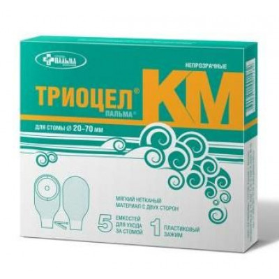 ТРИОЦЕЛ®-КМ – для стомы диаметром от 20 до 70 мм (непрозрачные). Однокомпонентные калоприёмники ТРИОЦЕЛ® состоят из ёмкости, системы крепления и запорного элемента. Ёмкости изготовлены из барьерной многослойной полимерной плёнки. Материал плёнки не пропускает запах содержимого ёмкости в течение всего времени использования изделия. Система крепления, состоящая из фланцевого элемента и герметизирующего адгезивного кольца, позволяет надёжно удерживать емкость на теле пациента и обеспечивает герметичность и отсутствие запаха. Гипоаллергенный материал герметизирующего кольца ТРИОЦЕЛ® разработан специально для нежной, чувствительной кожи. Именно поэтому с этим материалом выпускаются калоприемники с малым диаметром вырезаемого отверстия, которые могут быть использованы в том числе и для детей. Кроме того, в состав кольца входит альгинат натрия – природный полисахарид, обладающий ранозаживляющими свойствами, и вазелиновое масло, смягчающее и питающее кожу. Защитное покрытие адгезивного кольца имеет кольцевой трафарет с печатным изображением для вырезания отверстия в соответствии с диаметром стомы. У калоприёмников ТРИОЦЕЛ®-КМ обе стороны ёмкости закрыты мягкой нетканой подкладкой, что делает их совершенно бесшумными при ношении. Кроме того, эти ёмкости абсолютно непрозрачны. Калоприёмник может оставаться на коже в течение нескольких дней, не вызывая раздражения в месте крепления и обеспечивая комфортные условия для кожи вокруг стомы. Однокомпонентные калоприёмники ТРИОЦЕЛ®: - бесшумны при ношении; - незаметны под одеждой; - используются в течение нескольких дней без снятия со стомы; - препятствуют подтеканию содержимого калоприёмника и появлению неприятного запаха; - не вызывают раздражения (исключение – индивидуальная непереносимость).