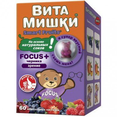 ВитаМишки® Focus+ - сбалансированный витаминно-минеральный комплекс в виде вкусных мармеладных пастилок мишек с натуральными фруктовыми и овощными экстрактами, для детей с 3-х лет