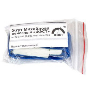 Жгут Михайлова венозный «ФЭСТ» №1 с застёжкой на крючок. Область применения: учреждения здравоохранения, службы скорой медицинской помощи, медицины катастроф, военной и экстремальной медицины, мобильные спасательные формирования, полевые условия, а также оказание первой помощи.